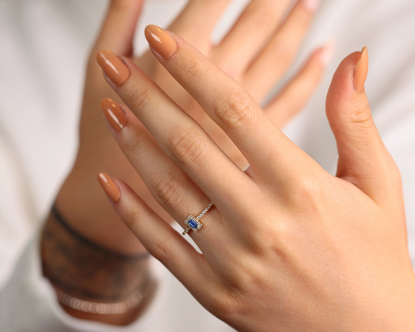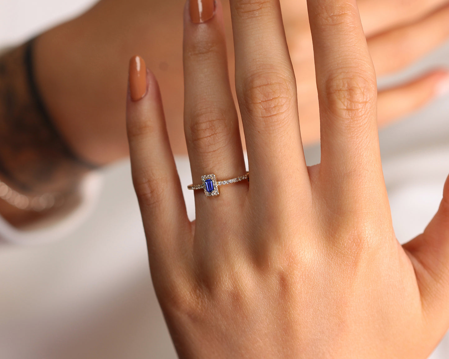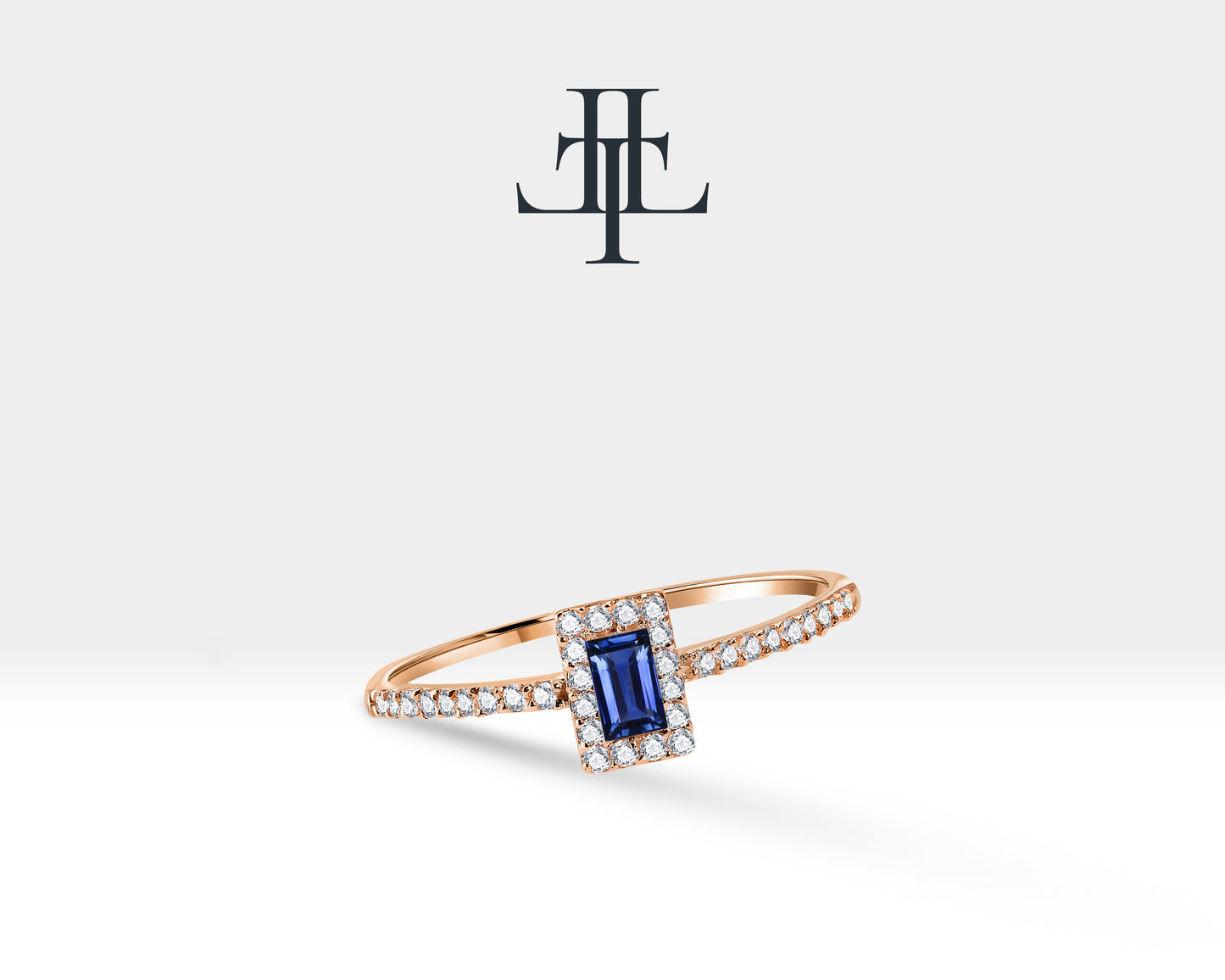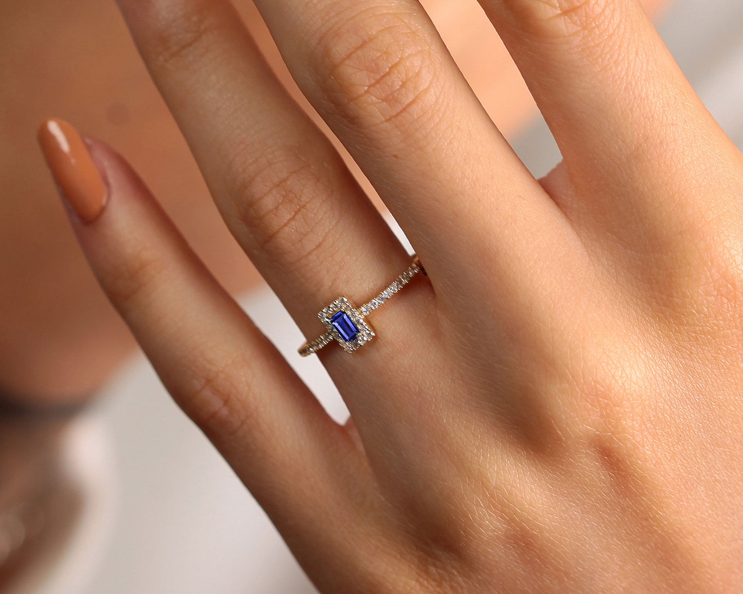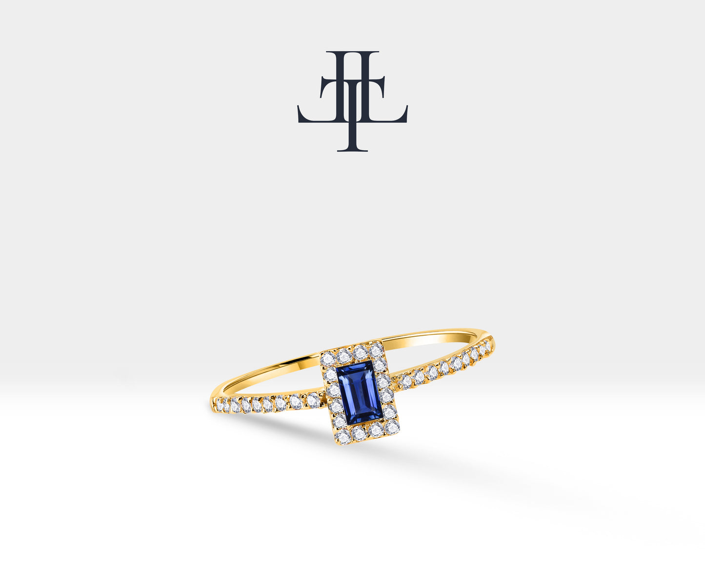 14K Yellow Solid Gold,Multi Stone Ring,Baguette Cut Sapphire and Diamond Ring