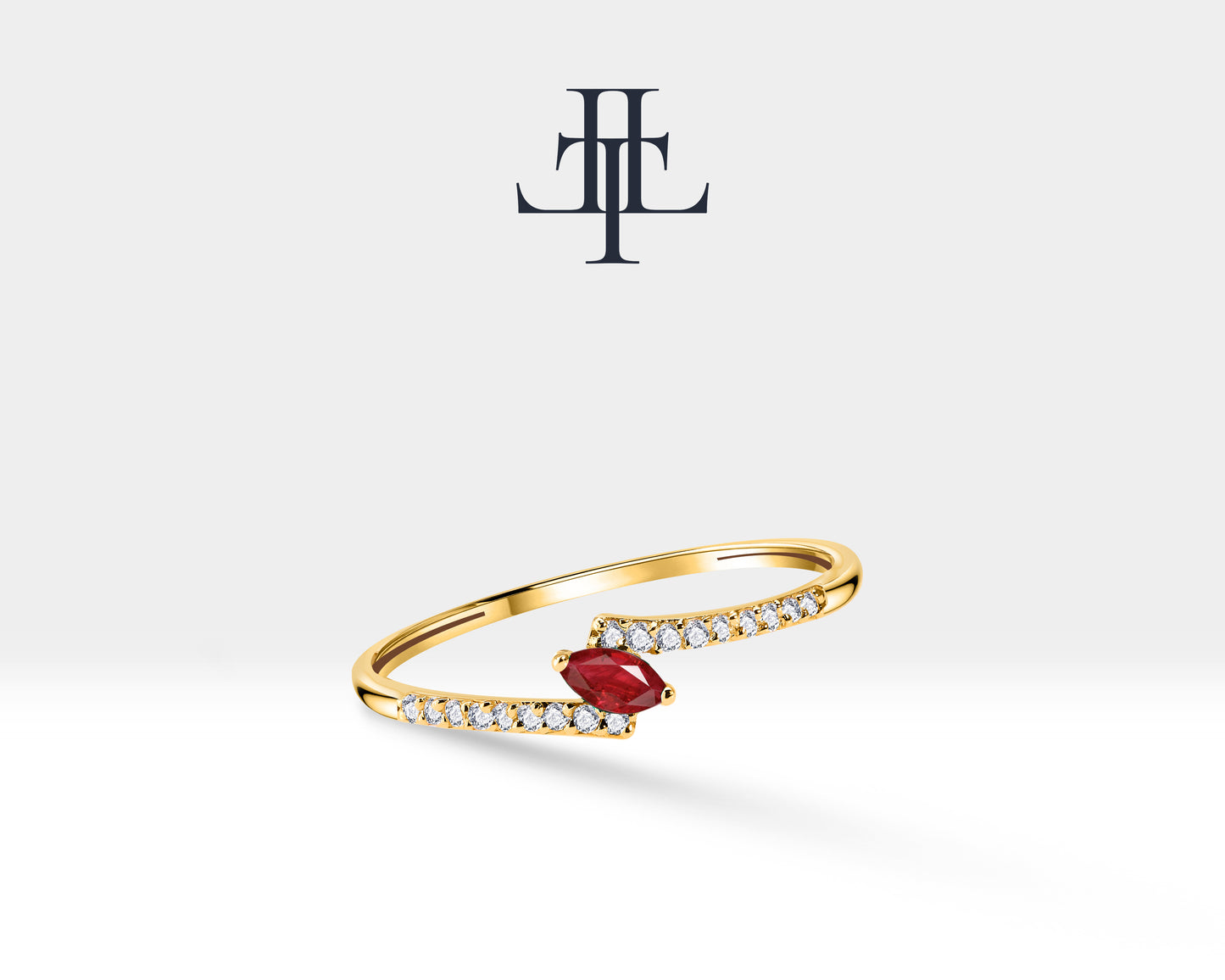 14K Yellow Solid Gold Ring,Marquise Cut Ruby Ring,Half Eternity Diamond Ring
