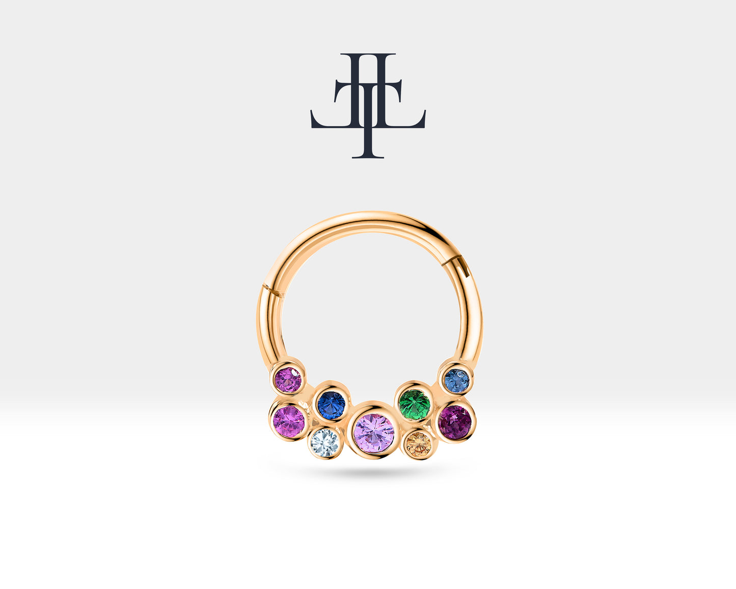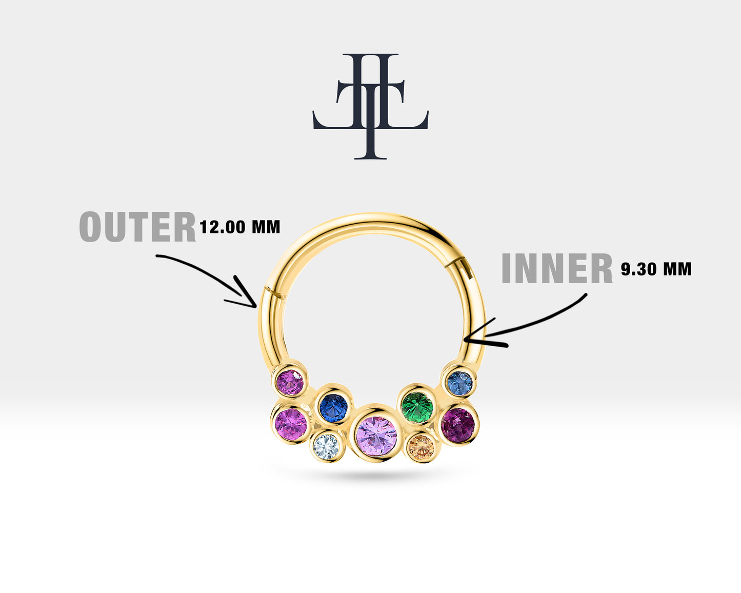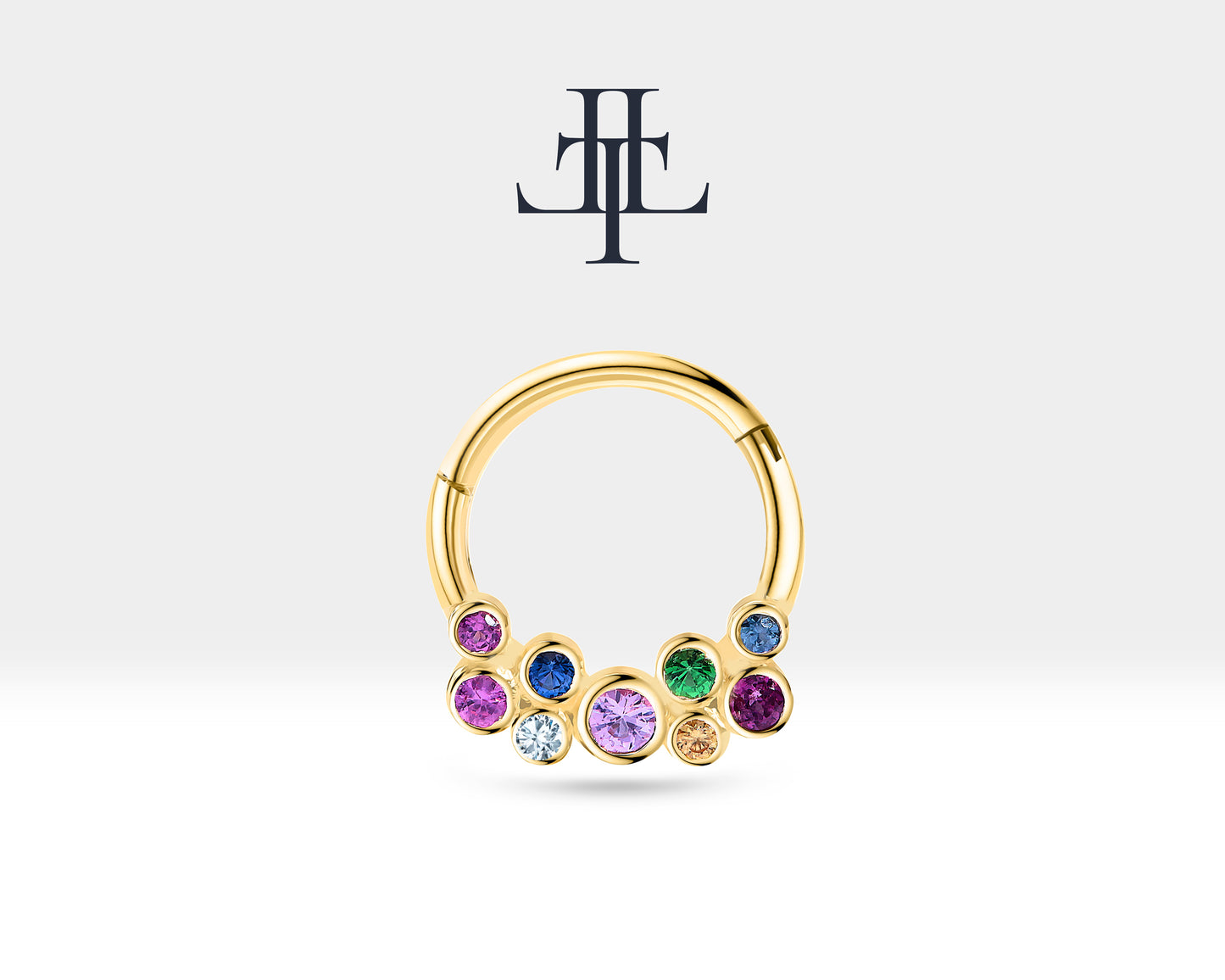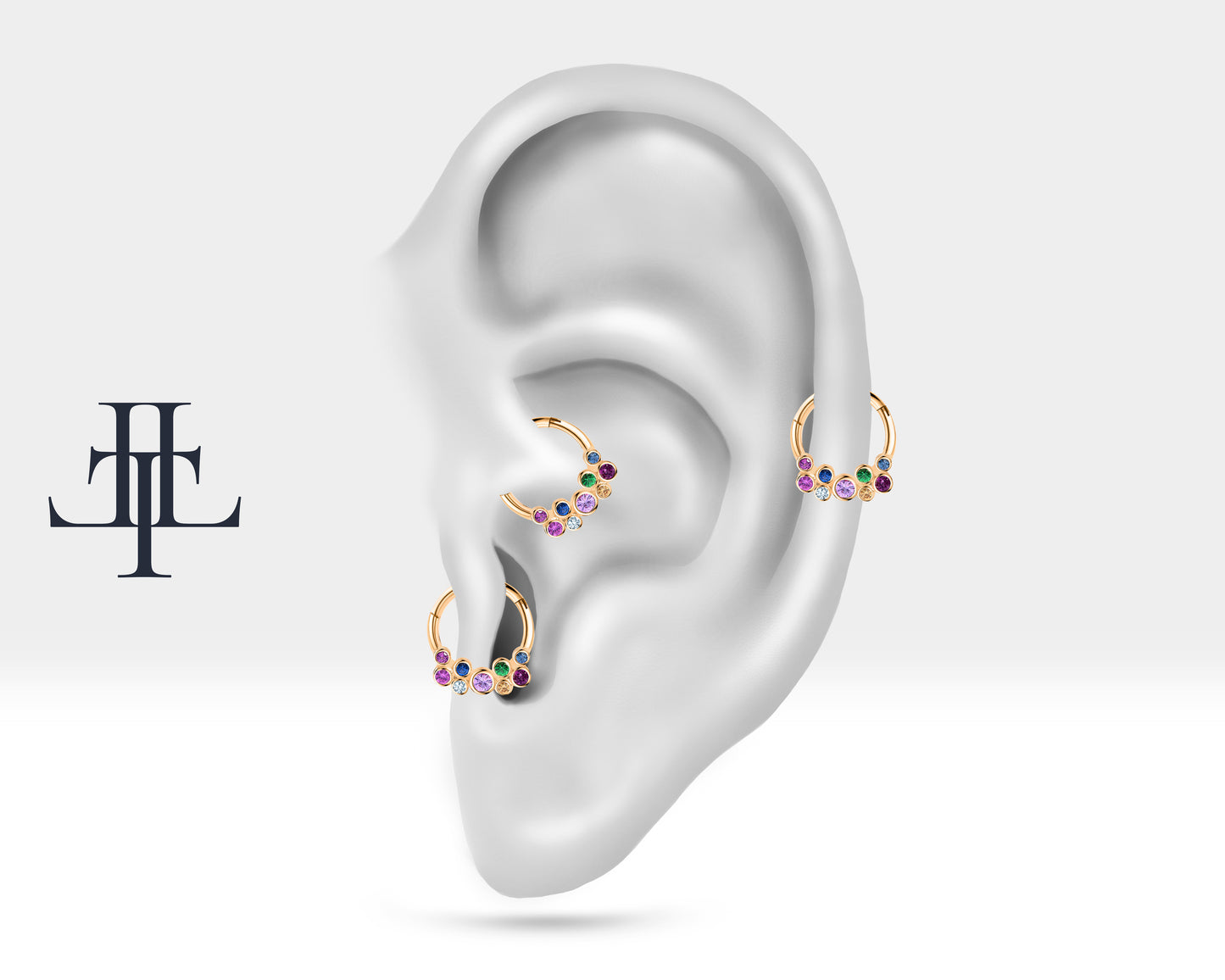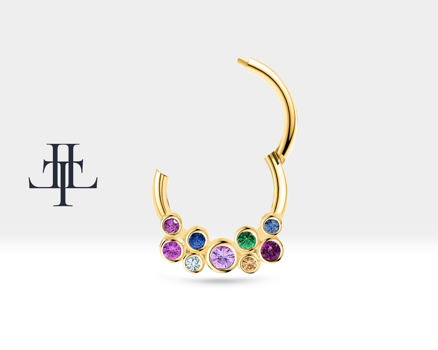 Cartilage Hoop Rainbow Design Sapphire Clicker Piercing Single Earring 14K Yellow- White- Rose Solid Gold /16G/ 10 mm 12 mm Outer Diameter Clicker