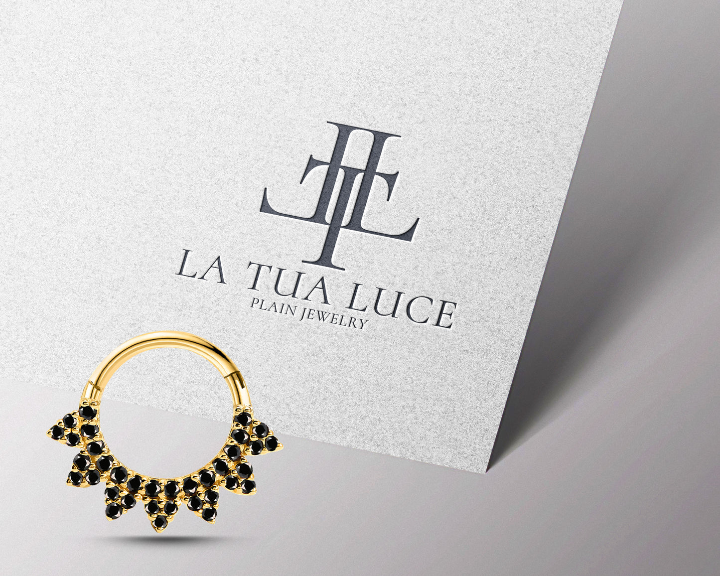 About this product: This gold hoop earrings are made of 14K gold and black diamond stones.This earring is ideal for cartilage,helix ,forword helix, daith, snug, rook and tragus piercings. It's a single earring.