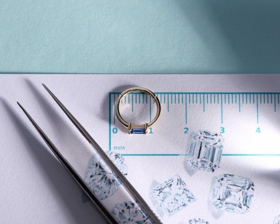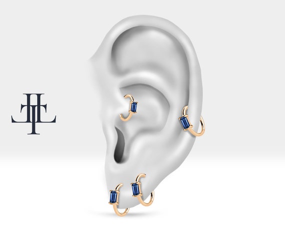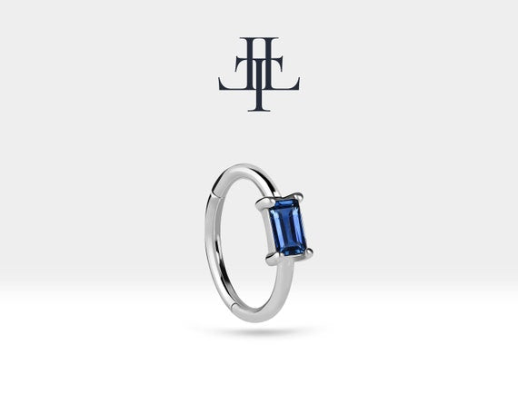 This baguette cut sapphire design product is a cartilage clicker piercing.Using natural sapphire stone adds privilege to the product. It can be preferred for lobe,rook, daith and tragus.
