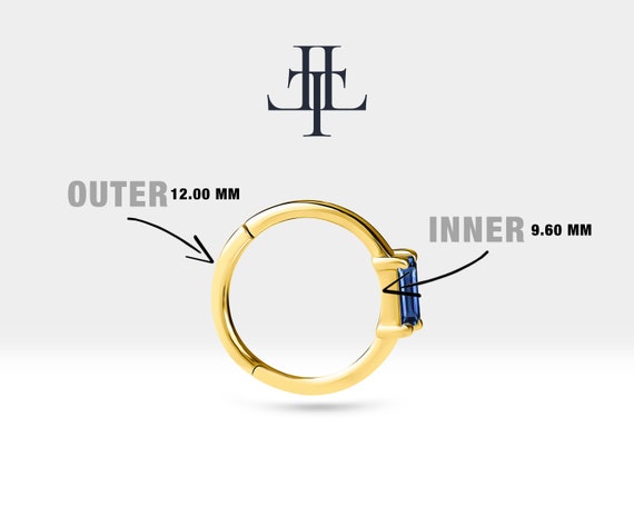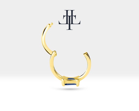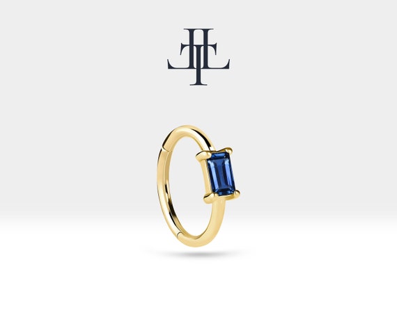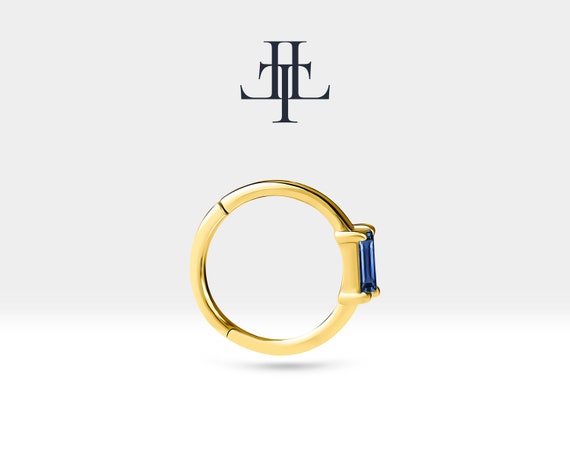 Hoop Baguette Cut Sapphire Piercing , 14K Yellow Solid Gold, Single Earring