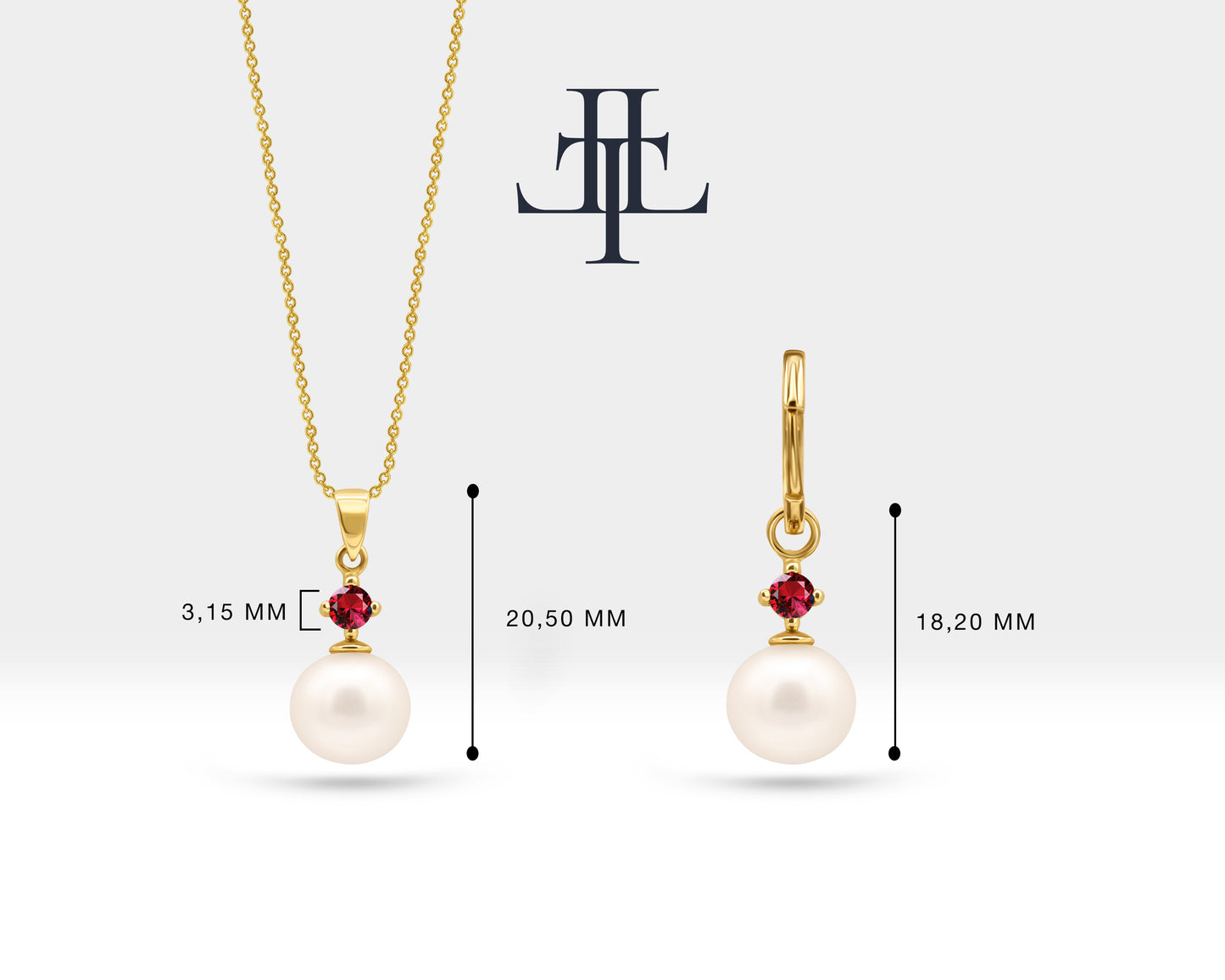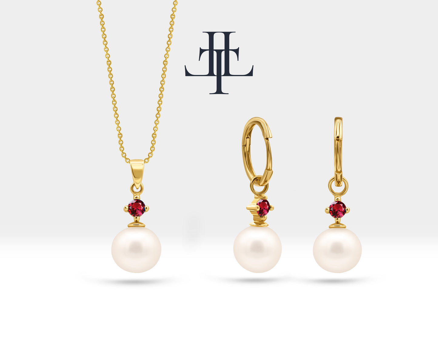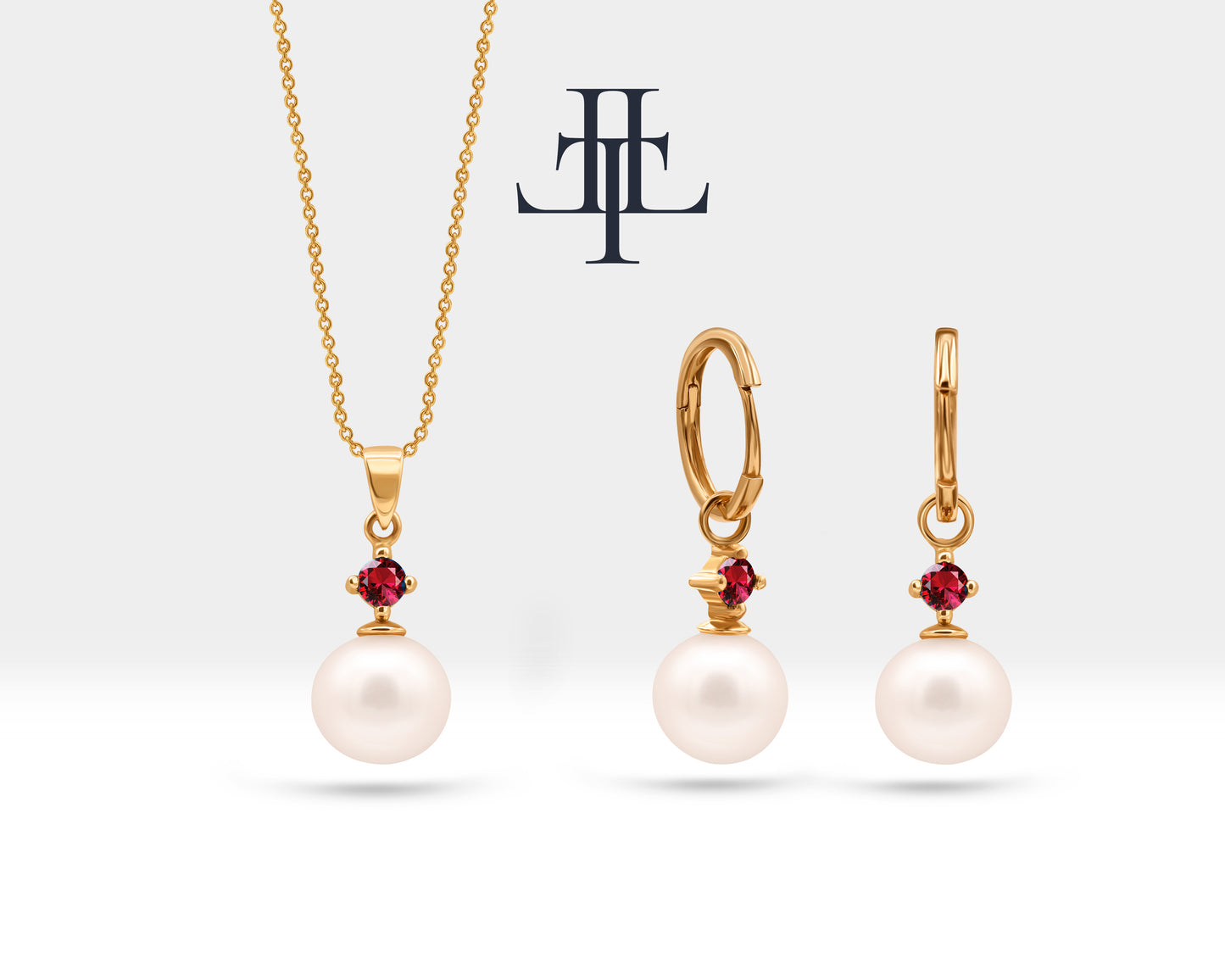 Bridal Jewelry Set of Pearl Earrings and Necklace Set in 14K Solid Gold Jewelry Set with Ruby and Natural Pearl