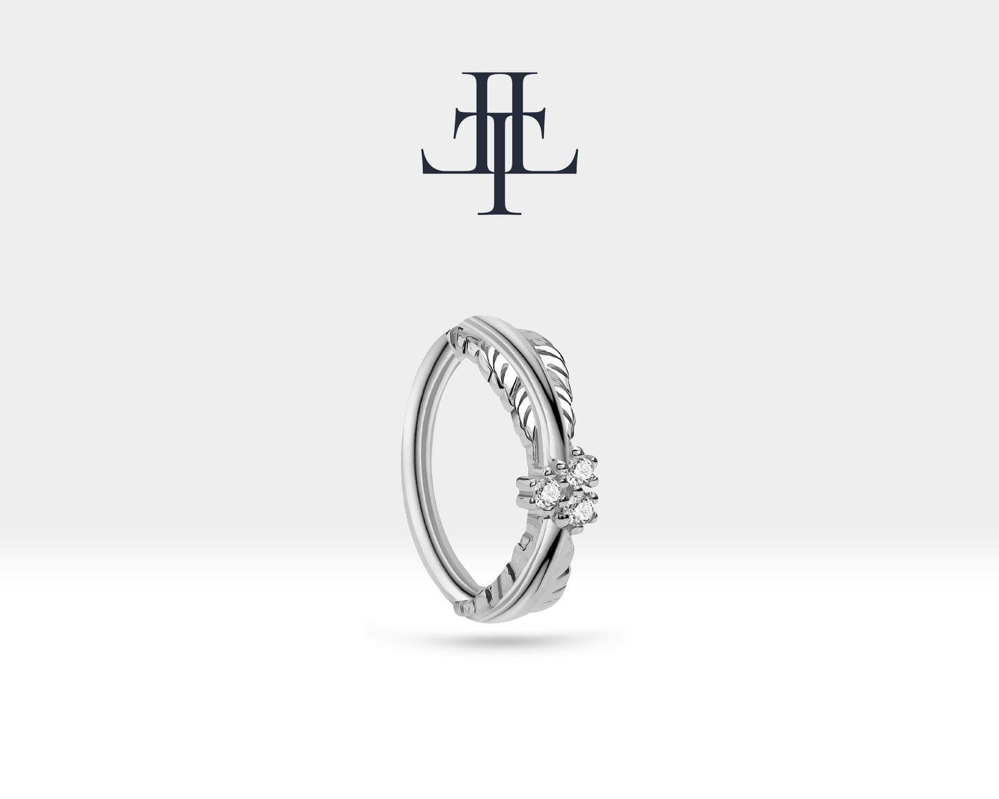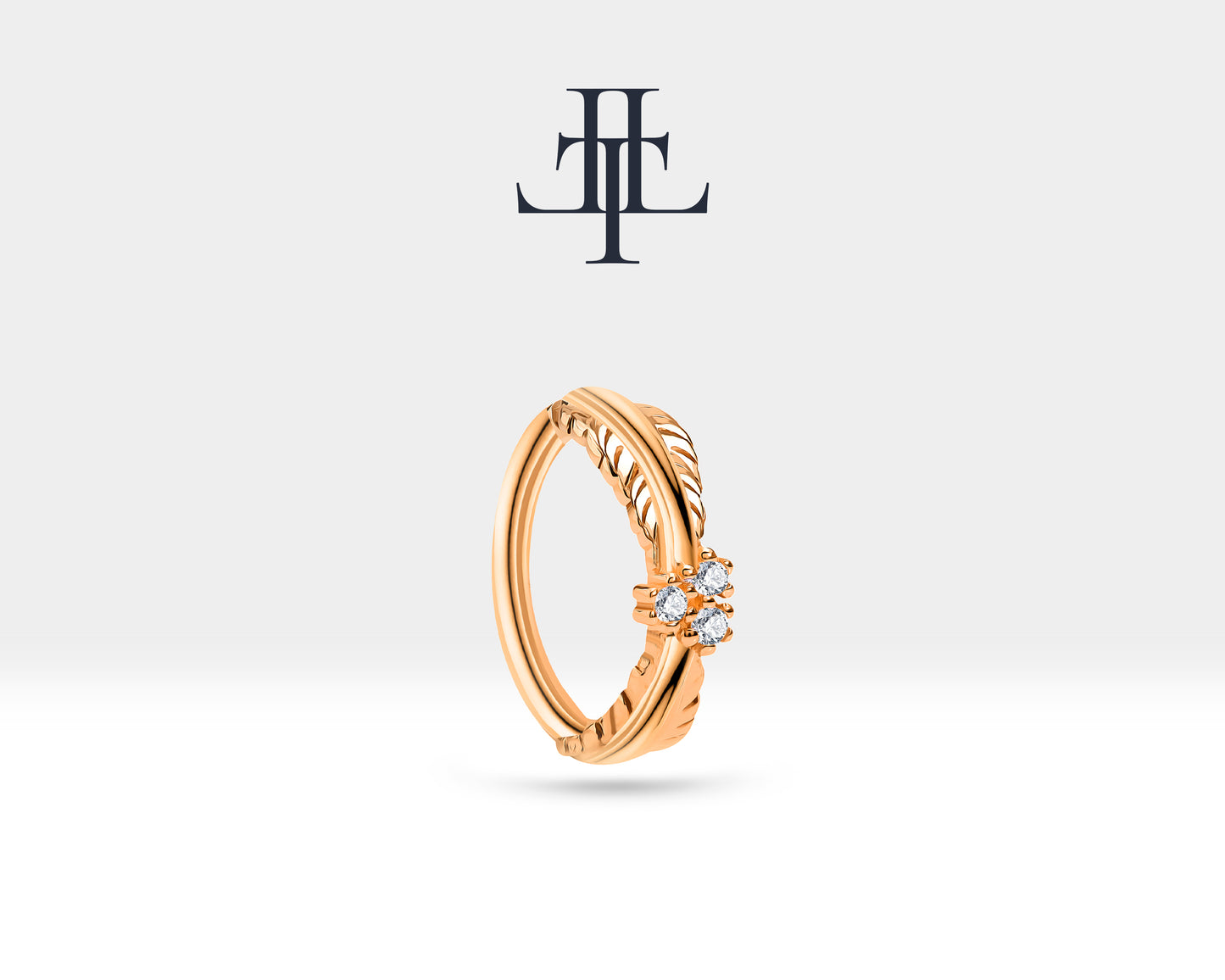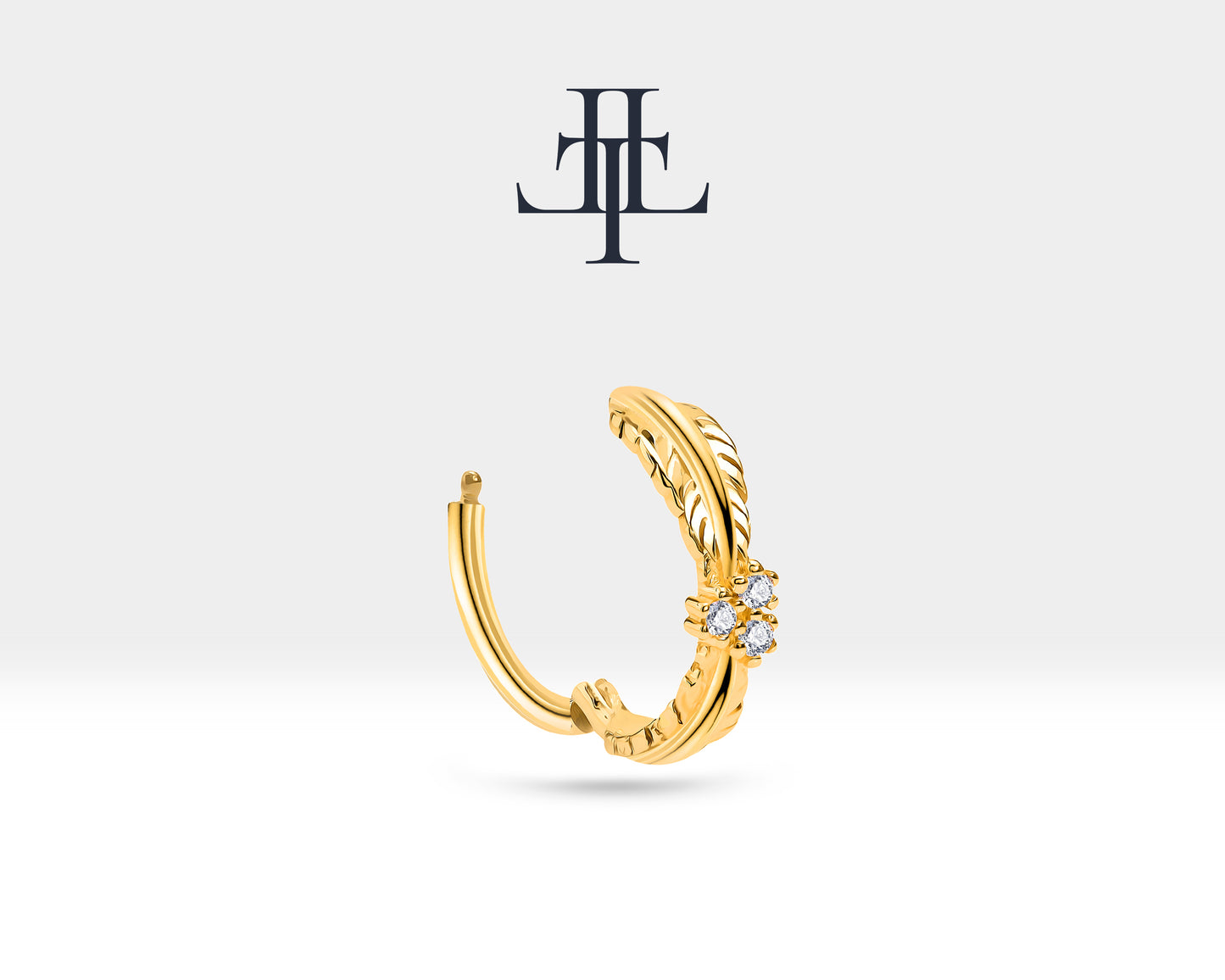 Cartilage Conch Leaf Design Diamond Clicker Piercing Single Earring 14K Yellow- White- Rose Solid Gold /18G/ 12 mm Outer Diameter Clicker