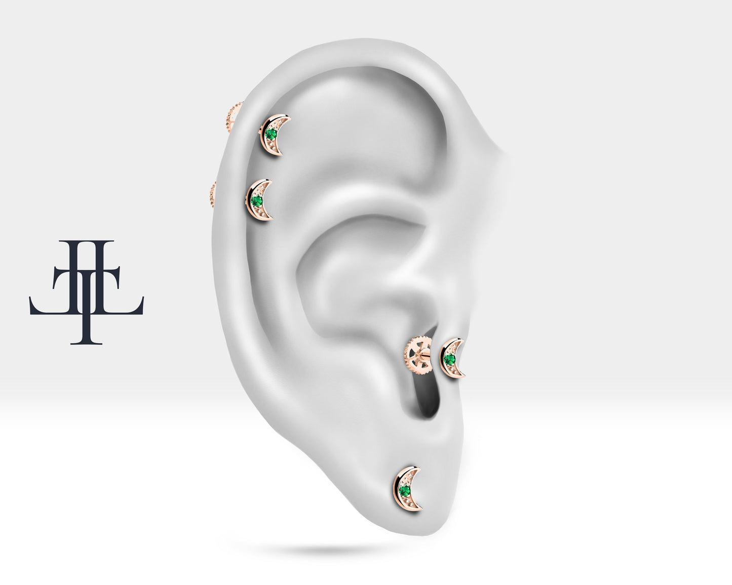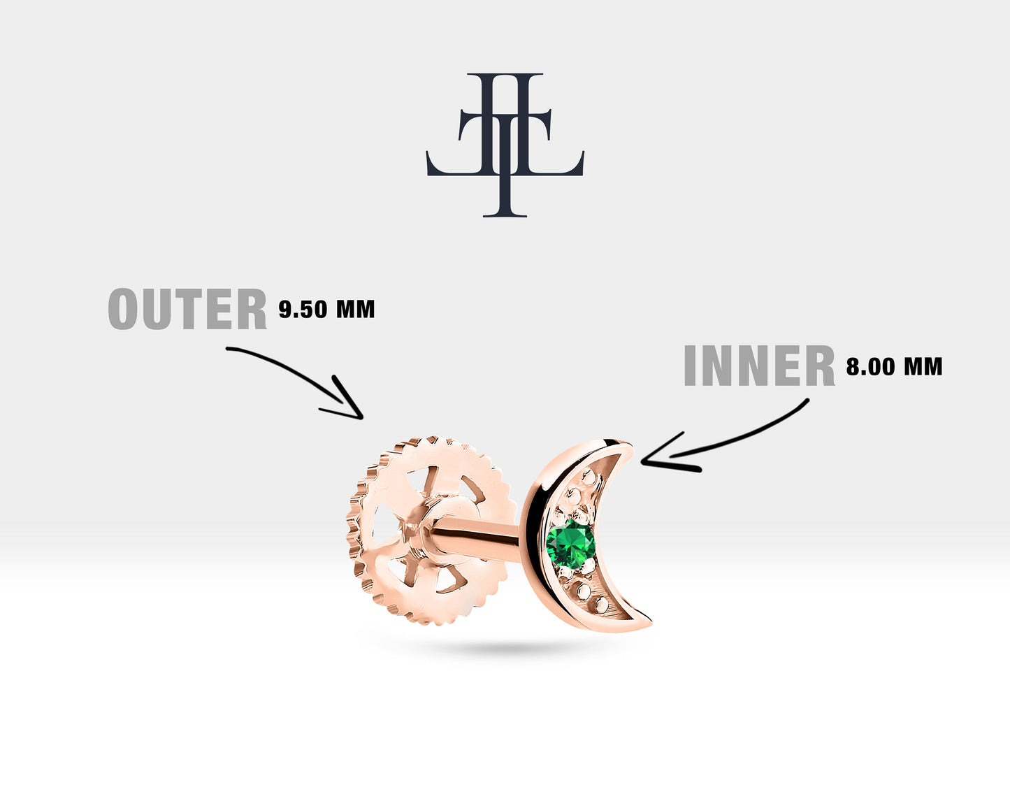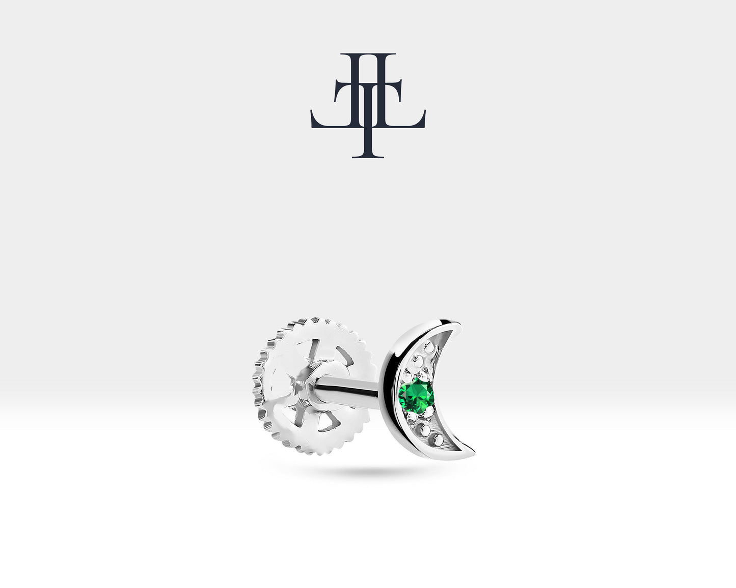 This sparkling moon design product is a cartilage piercing.Using natural emerald stone adds privilege to the product. It can be preferred for rook, daith and tragus.