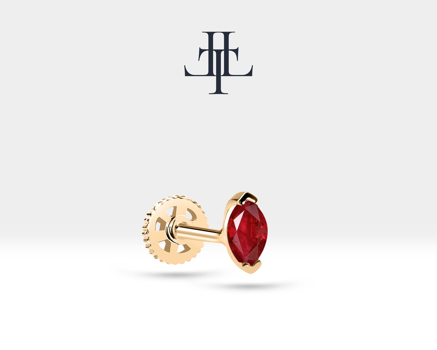 Cartilage Tragus Piercing Marquise-Cut Ruby Piercing Single Earring 14K White-Yellow- Rose Solid Gold Thickness 1 mm