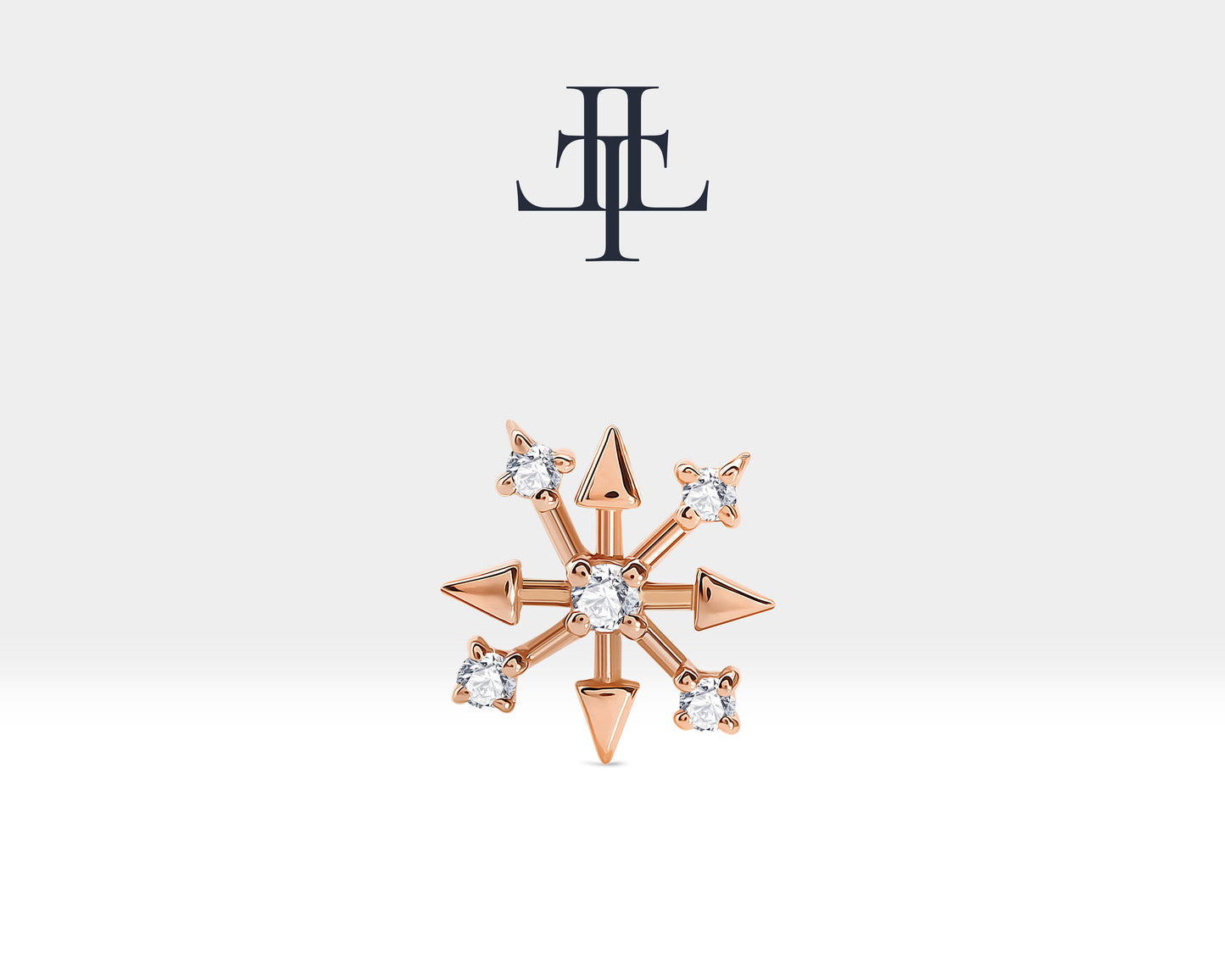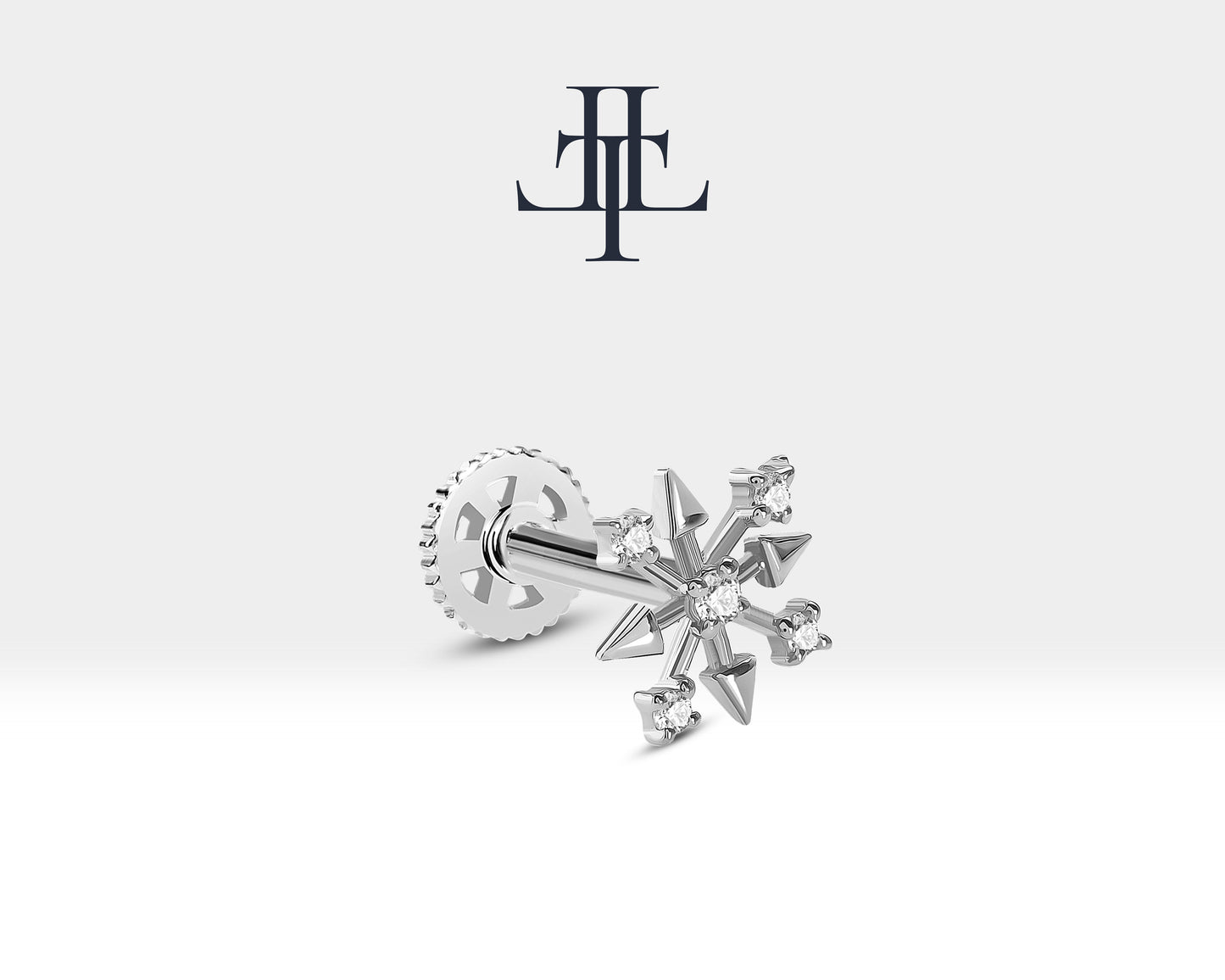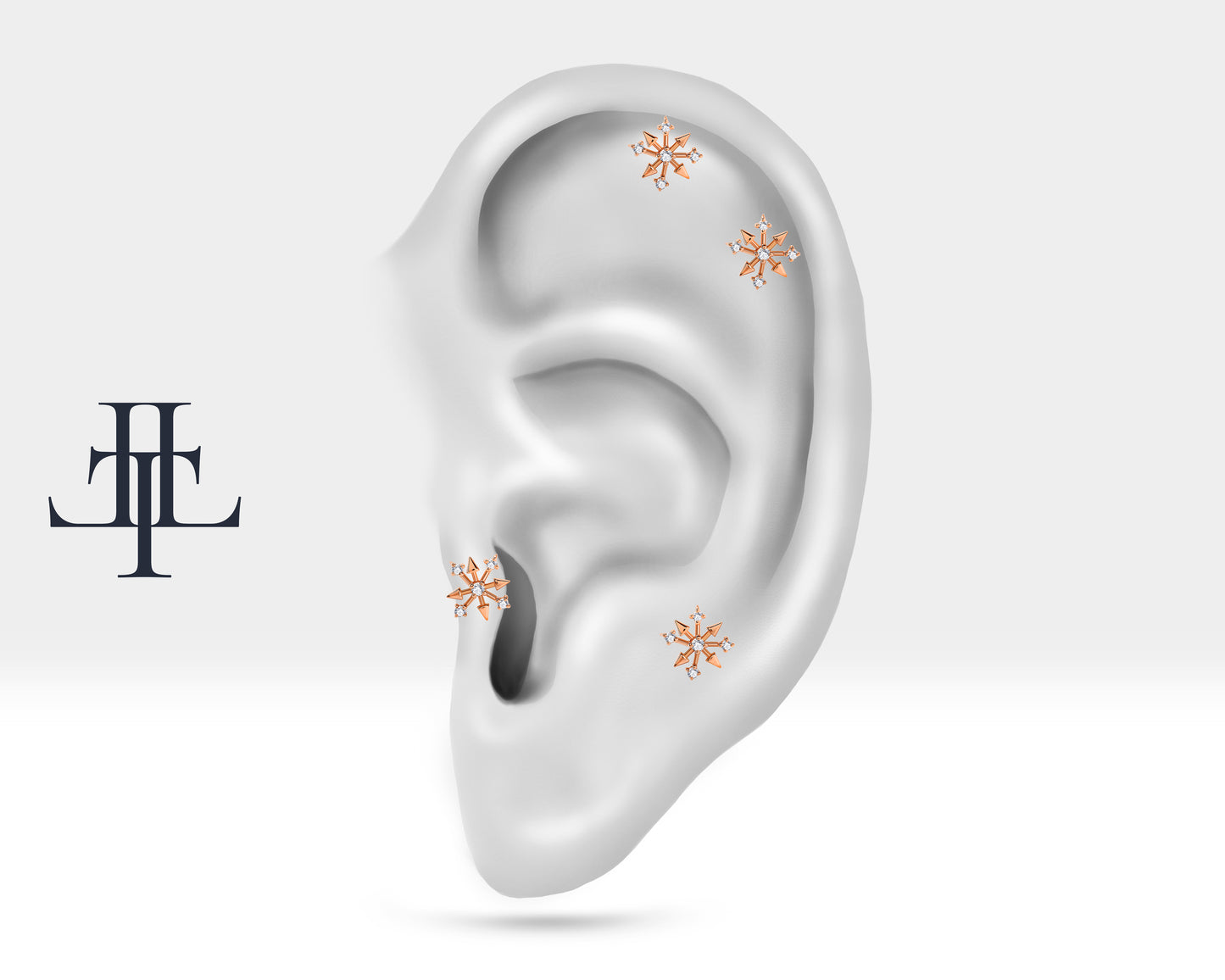 Cartilage Tragus Piercing Snow Flake Design Round Cut Diamond Piercing Single Piercing 14K White-Yellow- Rose Solid Gold Thickness 1.3 mm (16G)
