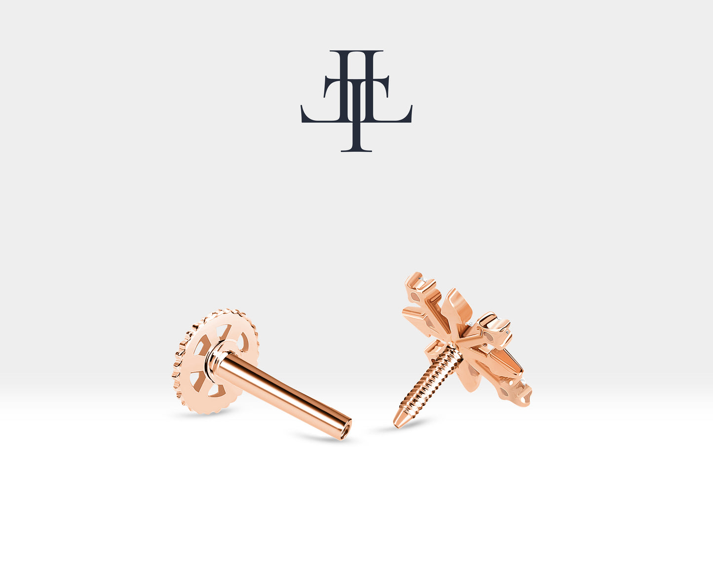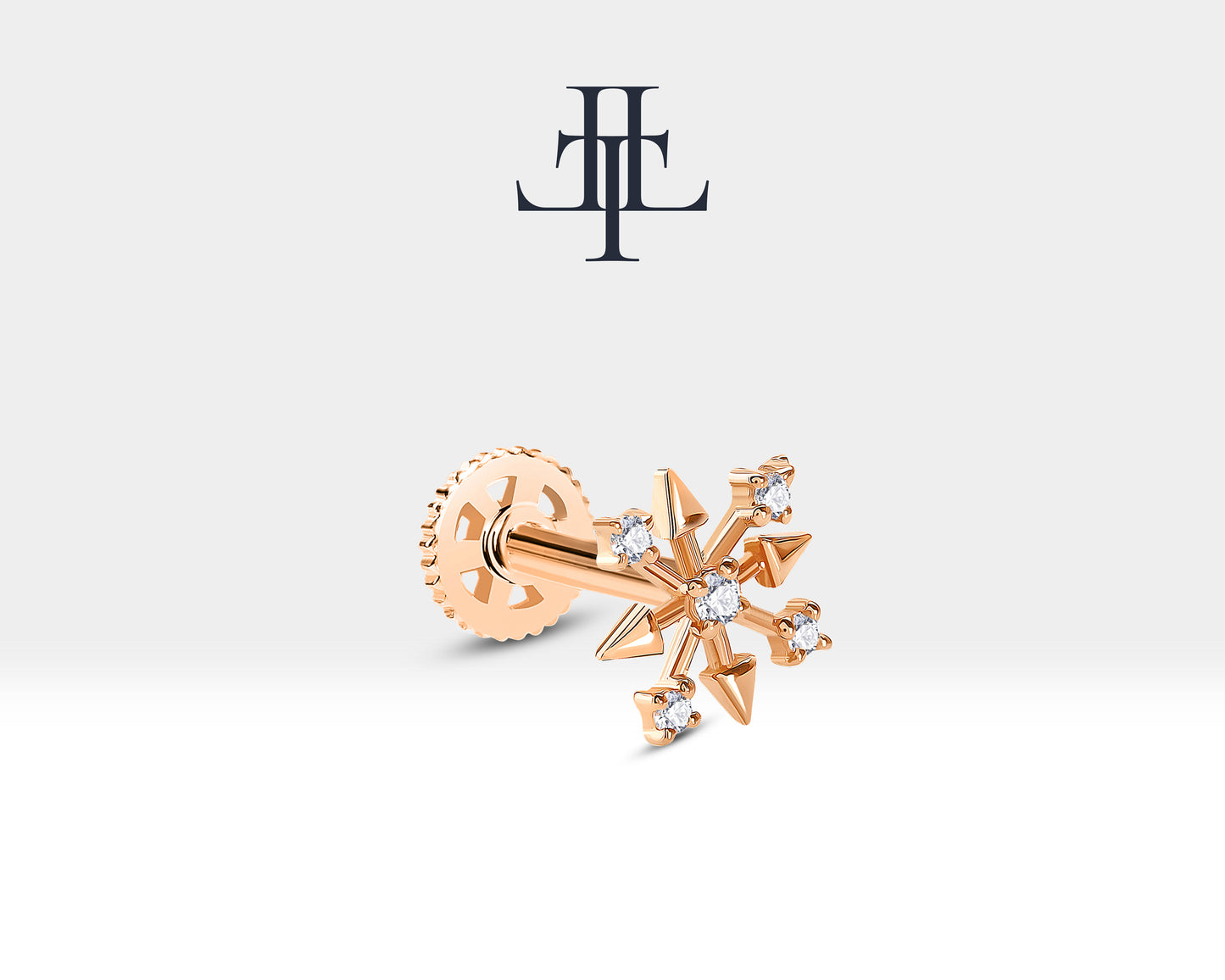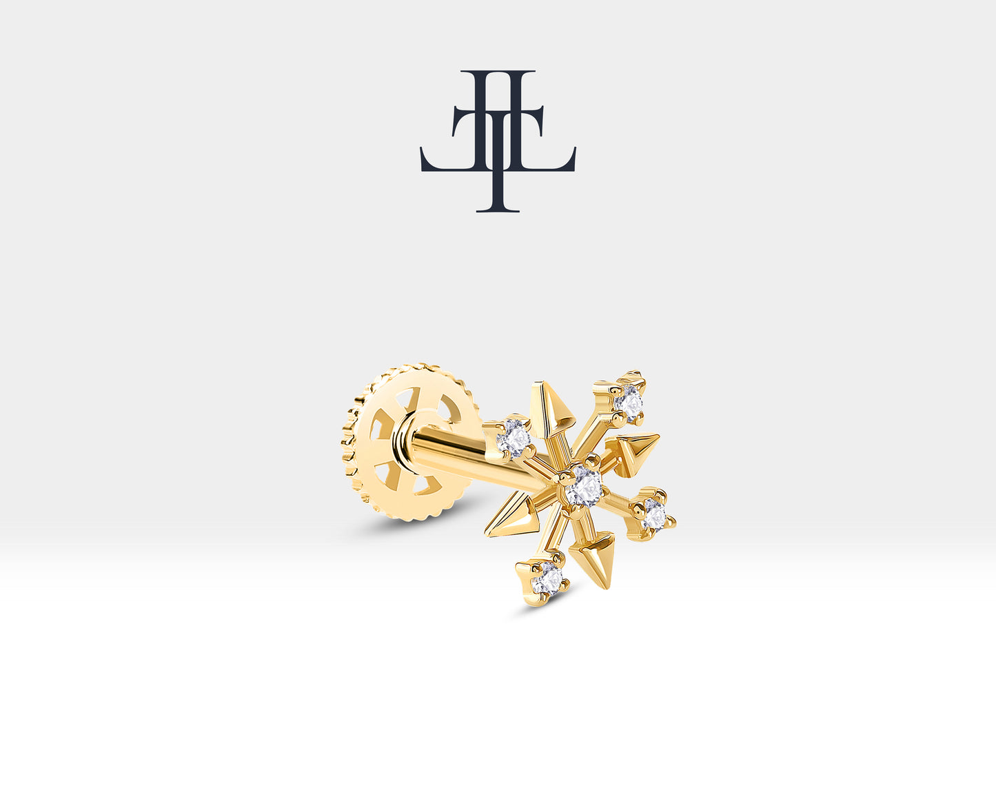 Cartilage Tragus Piercing Snow Flake Design Round Cut Diamond Piercing Single Piercing 14K White-Yellow- Rose Solid Gold Thickness 1.3 mm (16G)