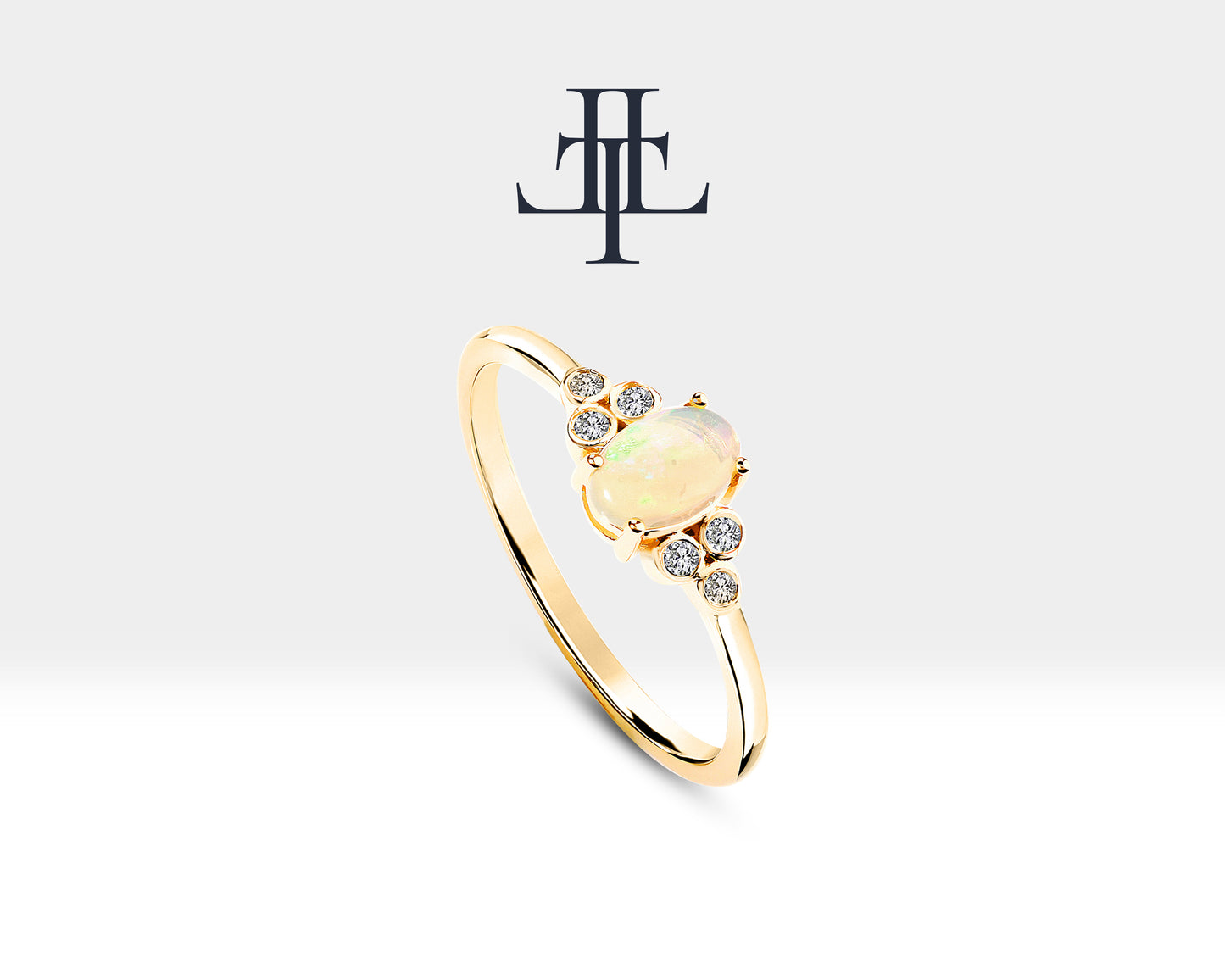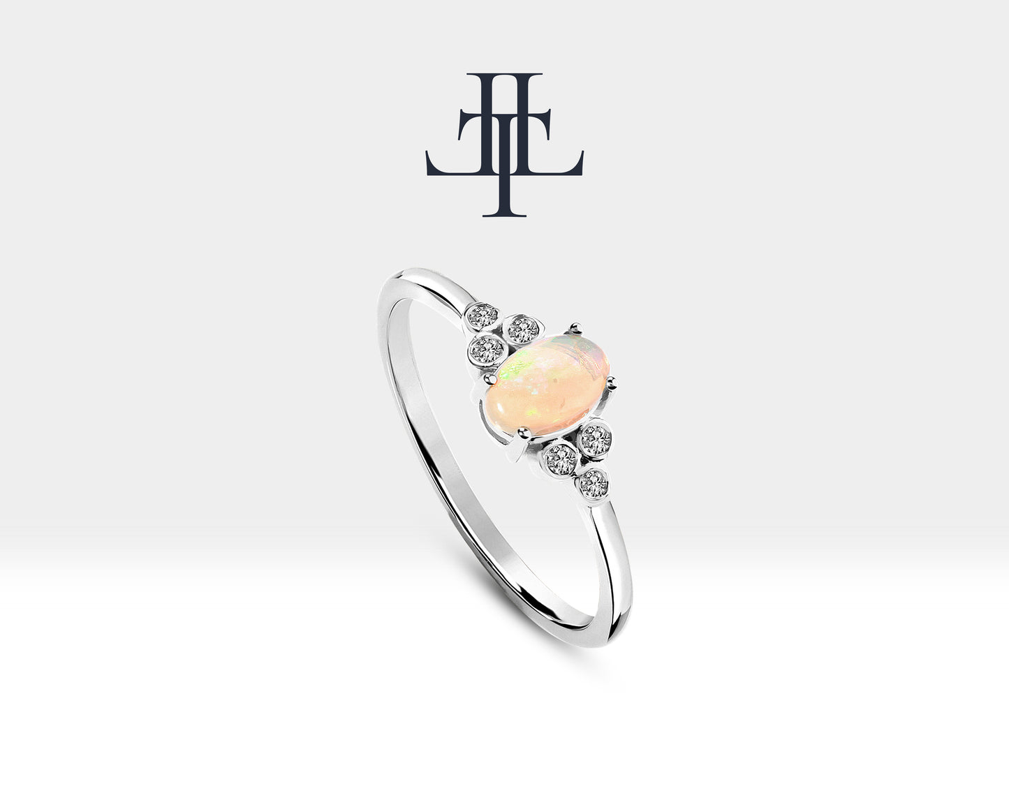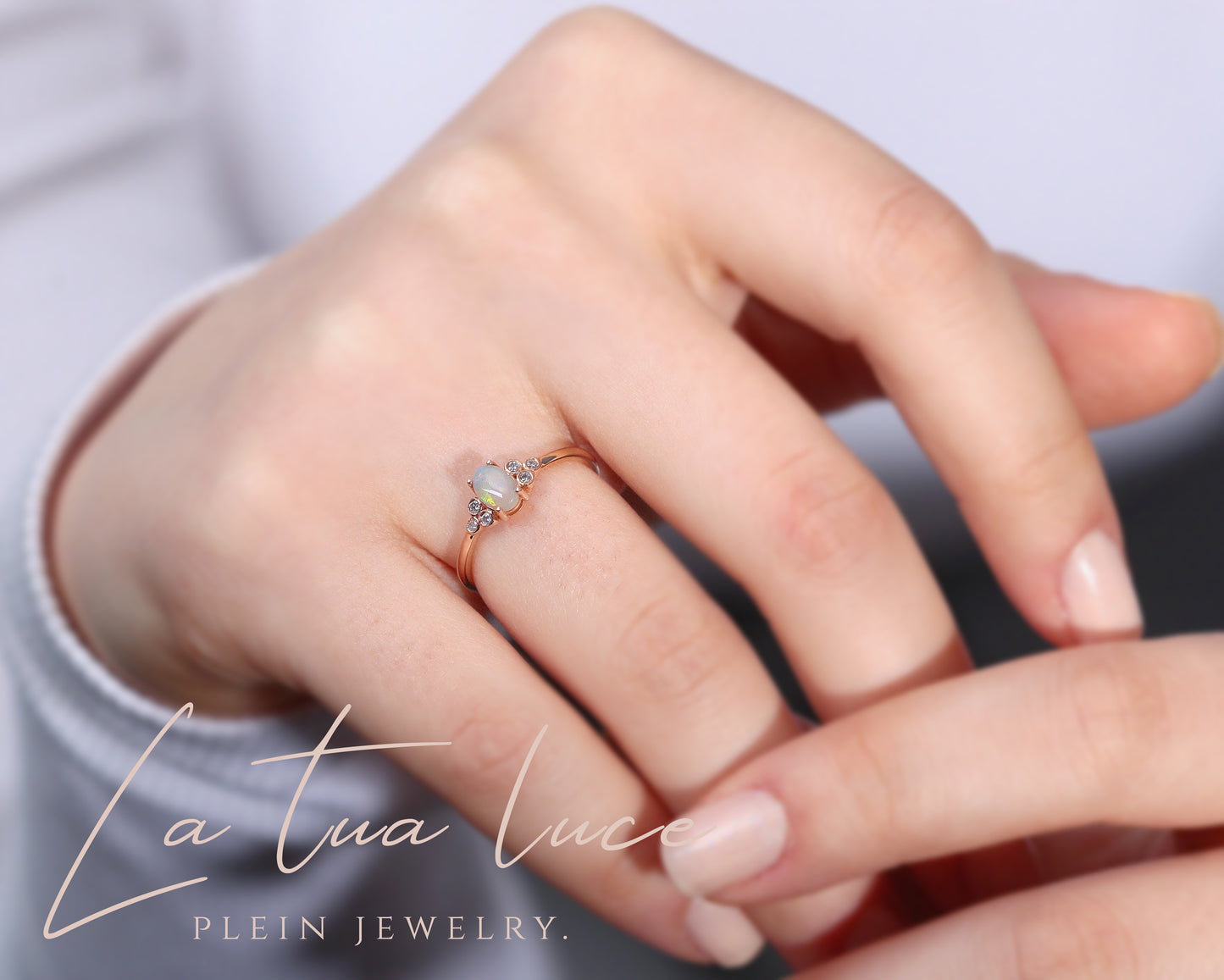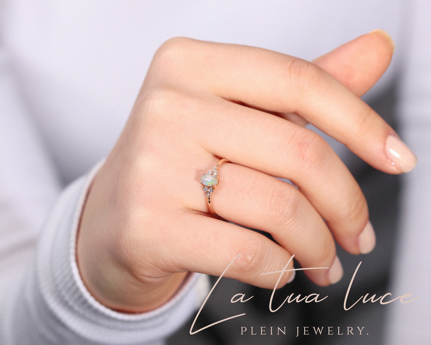Oval Opal and Diamond Rose Gold 14K Handmade Minimal Ring