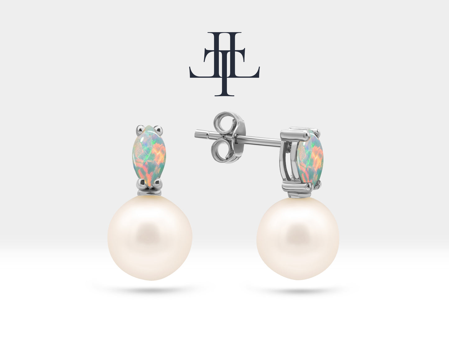 Pearl Earrings with Marquise Cut Opal Earring in 14K Solid Gold Stud Earrings for Women Wedding Jewelry