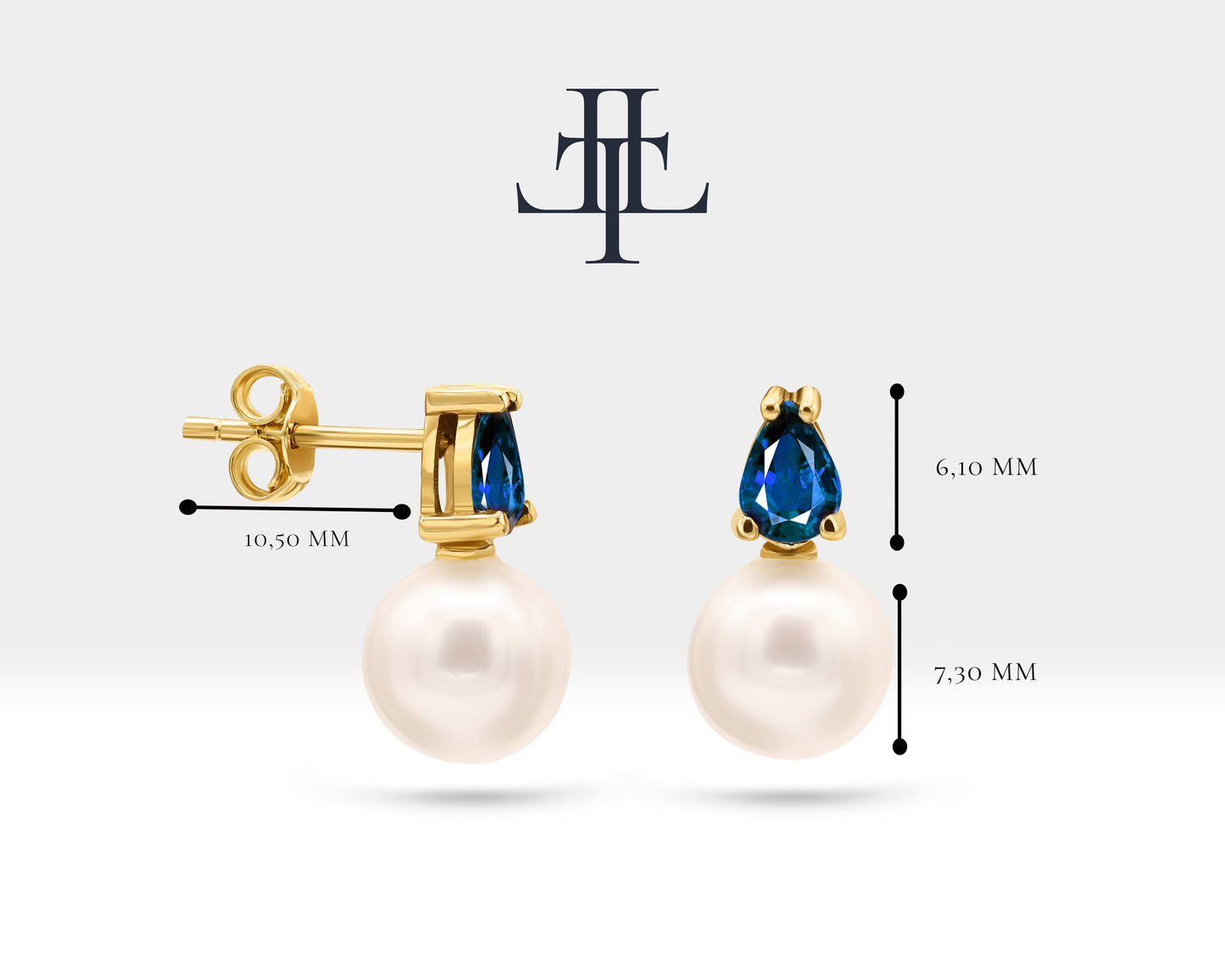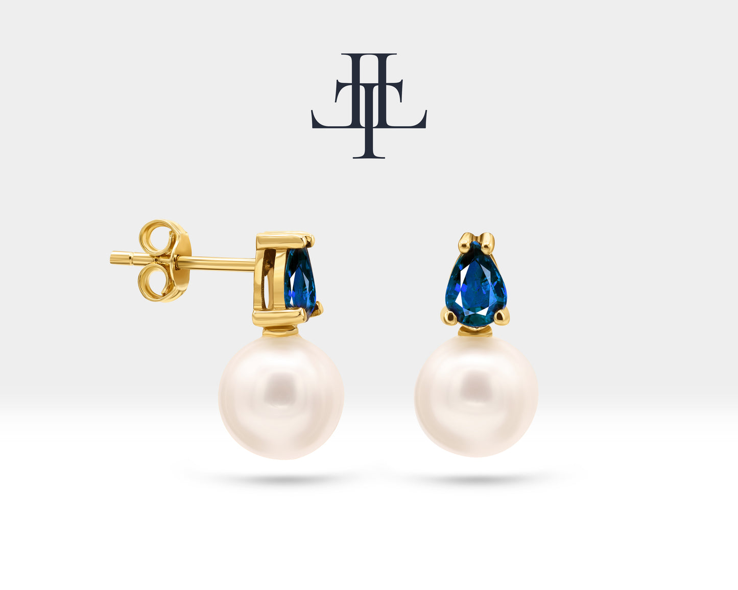 Pearl Necklace and Earrings Set in 14K Solid Gold Pearl Necklace Earring Set for Bridal Jewelry Set with Pear Cut Sapphire