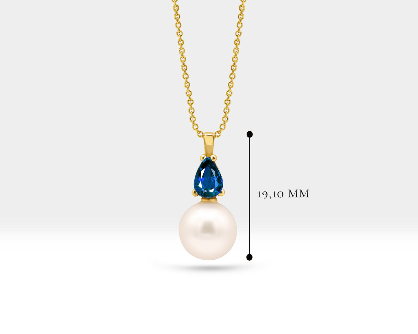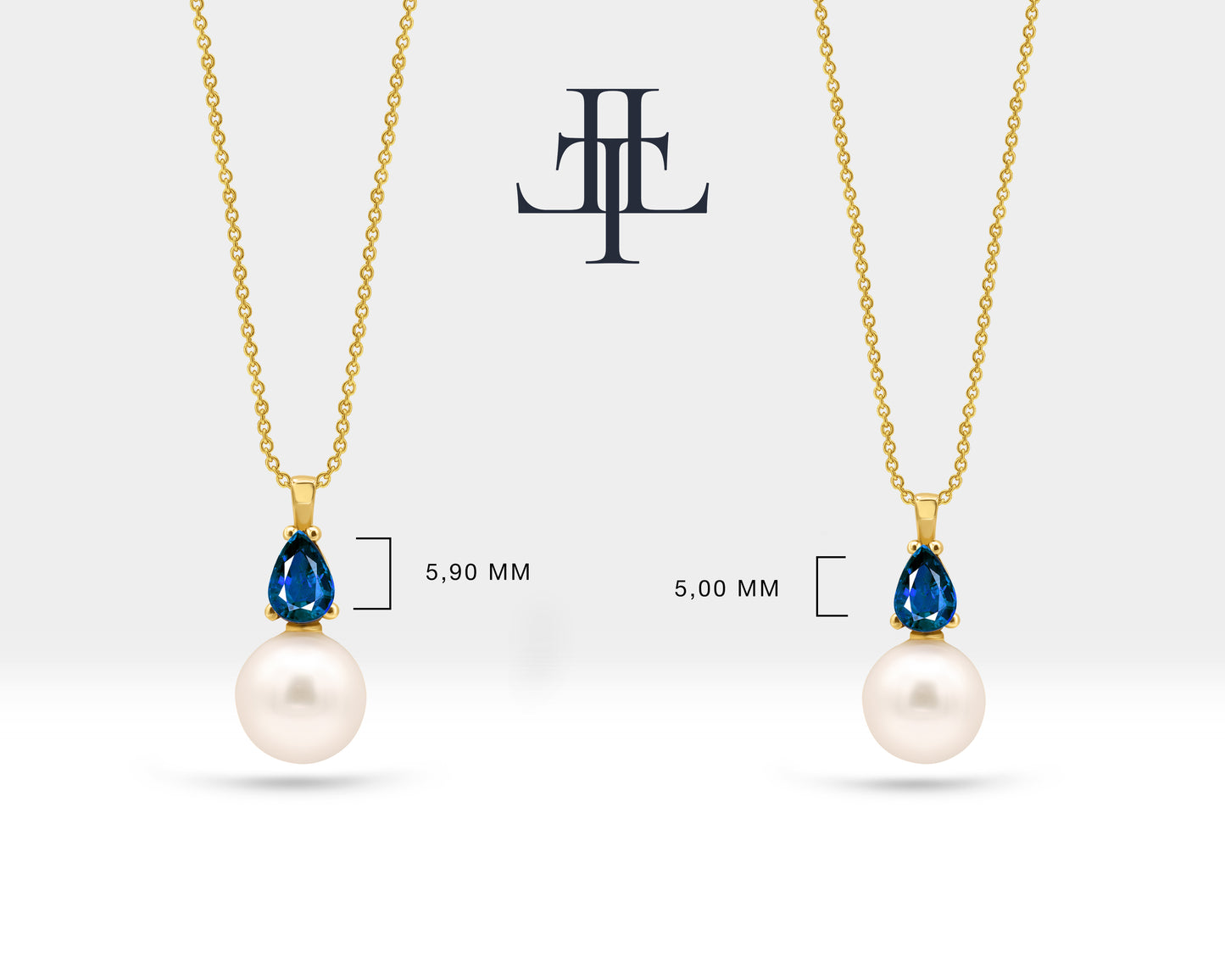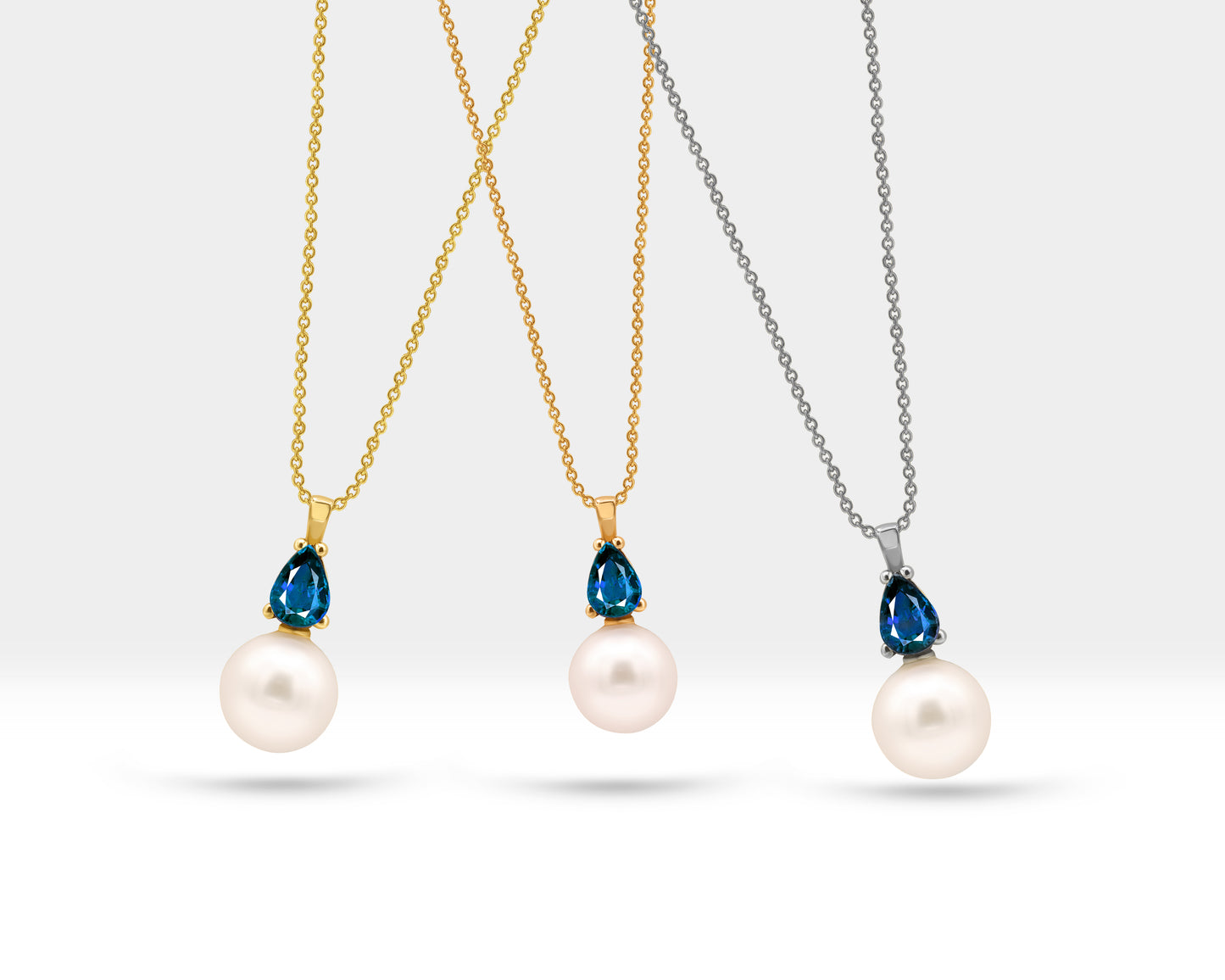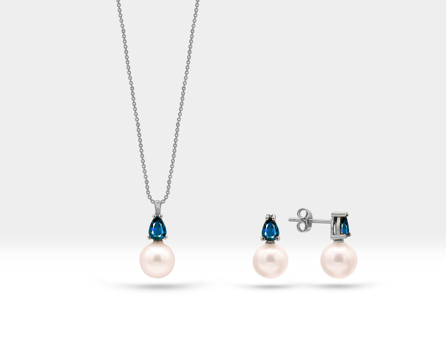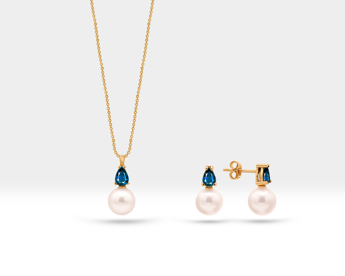 Home > > Pearl Necklace and Earrings Set in 14K Solid Gold Pearl Necklace Earring Set for Bridal Jewelry Set with Pear Cut Sapphire