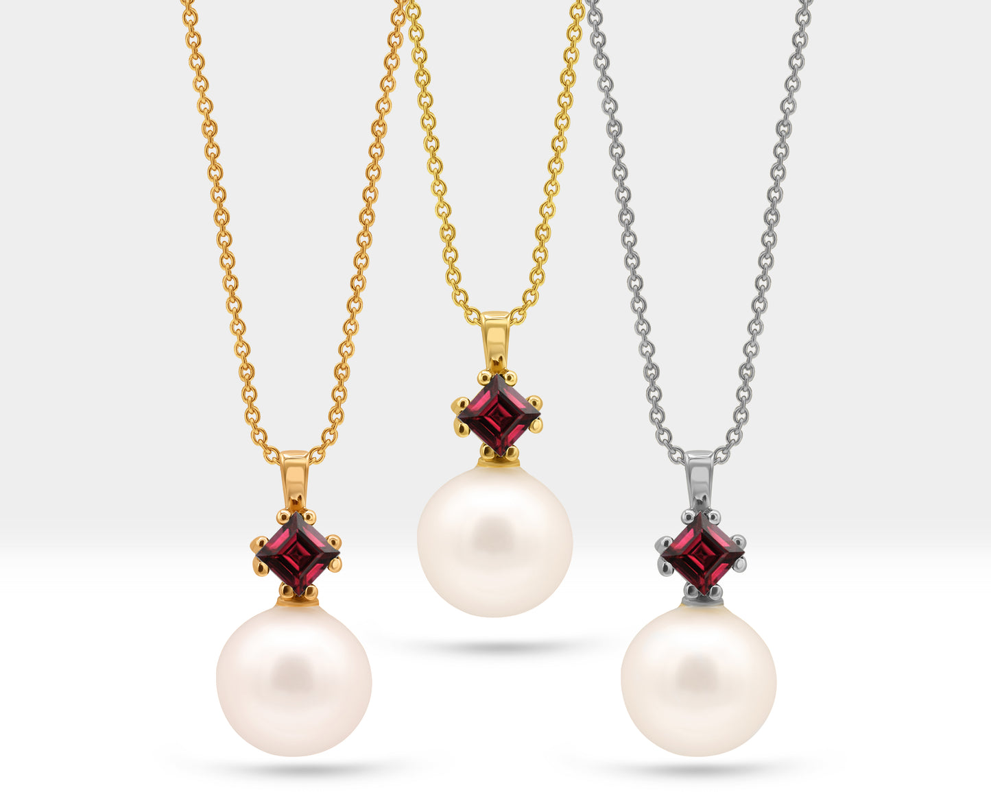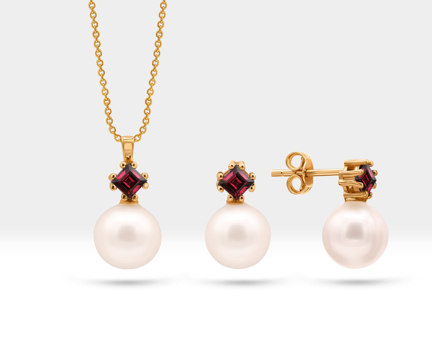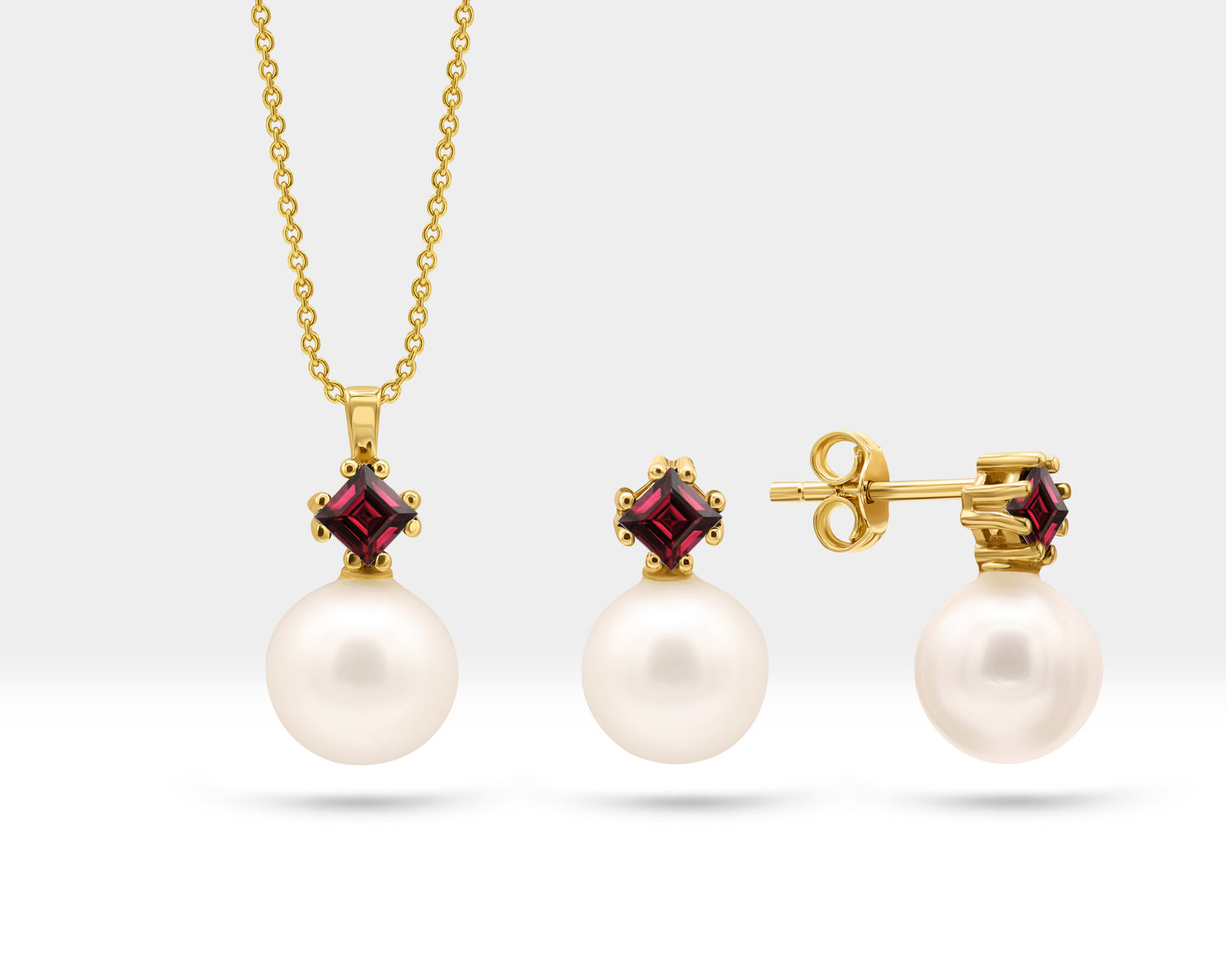 Pearl Set of Necklace and Stud Earrings in 14K Yellow Solid Gold Pearl and Princess cut Ruby Set for Wedding Jewelry Set for Brides
